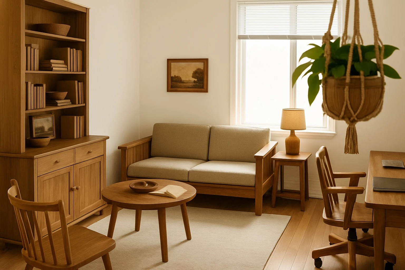 Avant / après Réaménagement d’un salon meublé en style organique avec reDecor AI